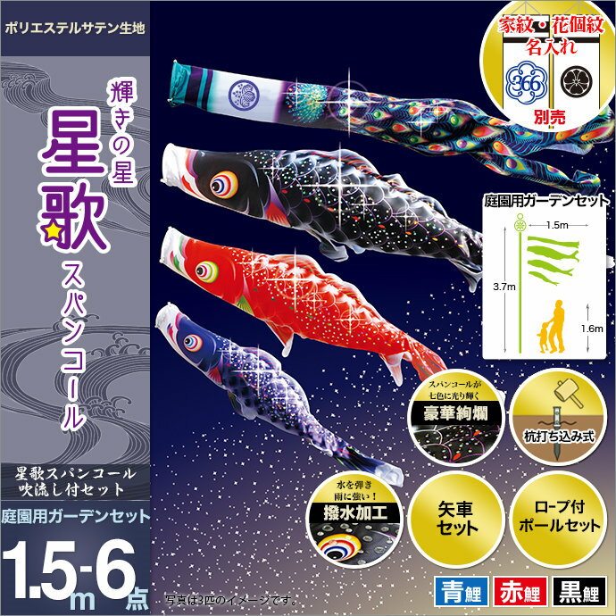 こいのぼり 庭 庭園用 徳永 家紋・名前入可能(矢車・ポール付) 1.5m6点セット 星歌スパンコール 庭園用ガーデンセット(ガーデン用・杭打ち込みタイプ 撥水加工鯉・ポリエステルサテン 鯉のぼり オシャレ