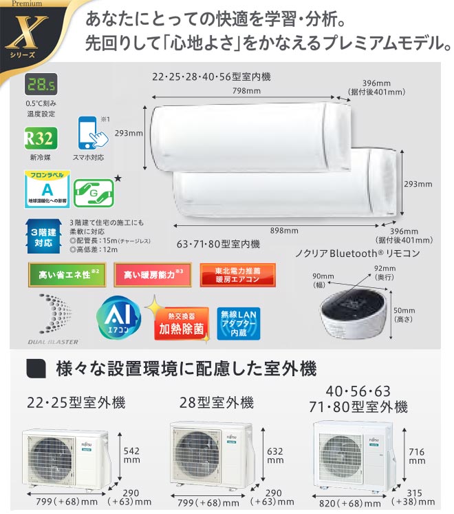 【キーワード】最安値挑戦 / クーラー / エアコン / 冷暖房 / 本体のみ / 20畳用 / 20畳以上 / 6.3kw / 空気清浄機能 / フィルター自動掃除 自動お掃除 自動清掃 自動洗浄 / 【 AS-X63J2-W の後継品 】AS-X63K2-W 商品説明シリーズ ノクリア nocria Xシリーズカラー ホワイト仕様・特徴 プレミアムモデル冷房/暖房:20畳程度単相200V・20AAIエアコン2020年モデルDUAL BLASTER(デュアルブラスター)プラズマ空清フィルター自動おそうじ洗えるダストボックス熱交換器加熱除菌内部クリーンハイドロフィリック熱交換抗菌・防カビ送風ファンインテリジェンス機能0.5°C刻み温度設定快適自動スイング(上下左右)ハイパワー運転再熱除湿ソフトクール除湿ランドリーモードホットキープ除霜左右独立ルーバーダブルAIつながるノクリアノクリアBluetoothリモコンスマートフォン連携スマートスピーカー対応おまかせノクリア(毎日快適モード)おまかせノクリア(毎日みまもりモード)操作内容お知らせ(音声)節電お知らせ(音声)電気代お知らせ(リモコン)最大電流カット毎日マルチタイマーおはようタイマーおやすみタイマー耐塩害仕様室外機室外機小動物侵入抑制構造コーティング基板リモコンホルダー別売HA端子対応HEMS機器対応(ECHONET Lite対応)3D温度センサー(室温・リモコン・床温)不在ECO高密度マルチパス熱交換器「I-PAM」制御インターリーブPAMインバーター無線LANアダプター内蔵 商品構成 エアコン室内機:AS-X63K2-W-IN×1 寸法:高さ293mm×幅898mm×奥行396mm(据付後401mm)エアコン室外機:AO-X63K2-OUT×1 寸法:高さ716mm×幅820(+68)mm×奥行315(+38)mm