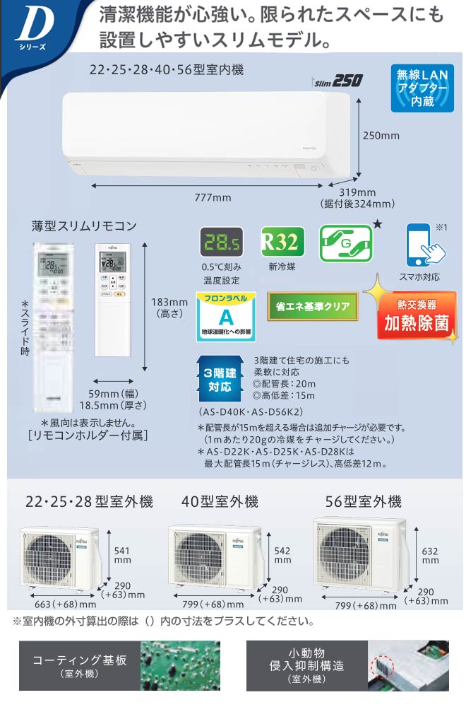 室外機小動物侵入抑制構造コーティング基板つながるノクリア定期フィルターおそうじ無線LANアダプター内蔵商品構成 エアコン室内機:AS-D25K-W-IN×1 外形寸法:高さ250×幅777×奥行319(据付後324)mmエアコン室外機:AO-D25K-OUT×1 外形寸法:高さ541×幅663(+68)×奥行290(+63)mm