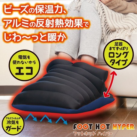 広告文責 有限会社ヴィヴィアン メーカー(製造元) アルファックス 商品区分 雑貨 ■品名 FOOT HOT HYPER (フットホットハイパー) ■商品サイズ:幅30×奥行12×高さ30cm 内容量:380g ■生産地:中国 ■素材・成分:材質:ポリエステル、ポリウレタン 冷え性 グッズ 足 対策 あったか 指先 温める 冷え性対策 あったかグッズ 足首 エコ [FOOT HOT HYPER (フットホットハイパー)]ビーズの保温力、アルミの反射熱効果でじわーっと暖か 電源は使わず、あくまでも体温熱を増幅させて足元を暖めるFOOT HOT HYPER。