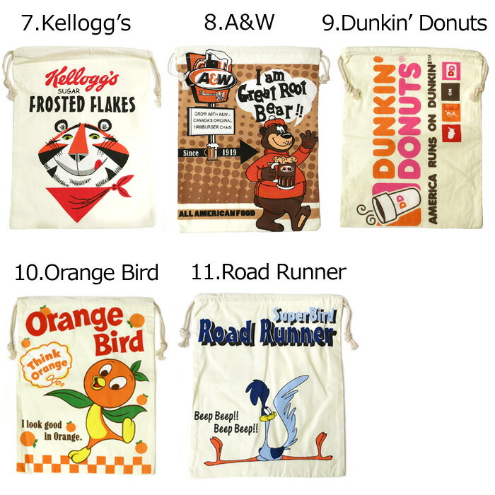 3枚以上のご注文は宅配便発送に変更させていただきます ▼△《全12柄》巾着大サイズ他デザインはこちら▼△ ▼△《全20柄》小さいサイズの巾着袋はこちら▼△ ▼△《お弁当用にも》にこちゃん巾着袋はこちら▼△ サイズ 縦約34cm×横約26cm デザイン 1.HEINZ/ハインツ 2.Campbell's/キャンベル 3.FUNNY FACE/ファニーフェイス 4.M&M's/エムアンドエムズ 5.BURGER KING/バーガーキング 6.Big Boy/ビッグボーイ 7.Kellogg's/ケロッグ 8.A&W/エーアンドダブリュ 9.Dunkin'Donuts/ダンキンドーナツ 10.Orange Bird/オレンジバード 11.Road Runner/ロードランナー 素材 綿100%・※片面に柄のプリント 生産国 中国 ご注意 ※入荷時期により多少デザインや色の濃淡が異なる場合があります。