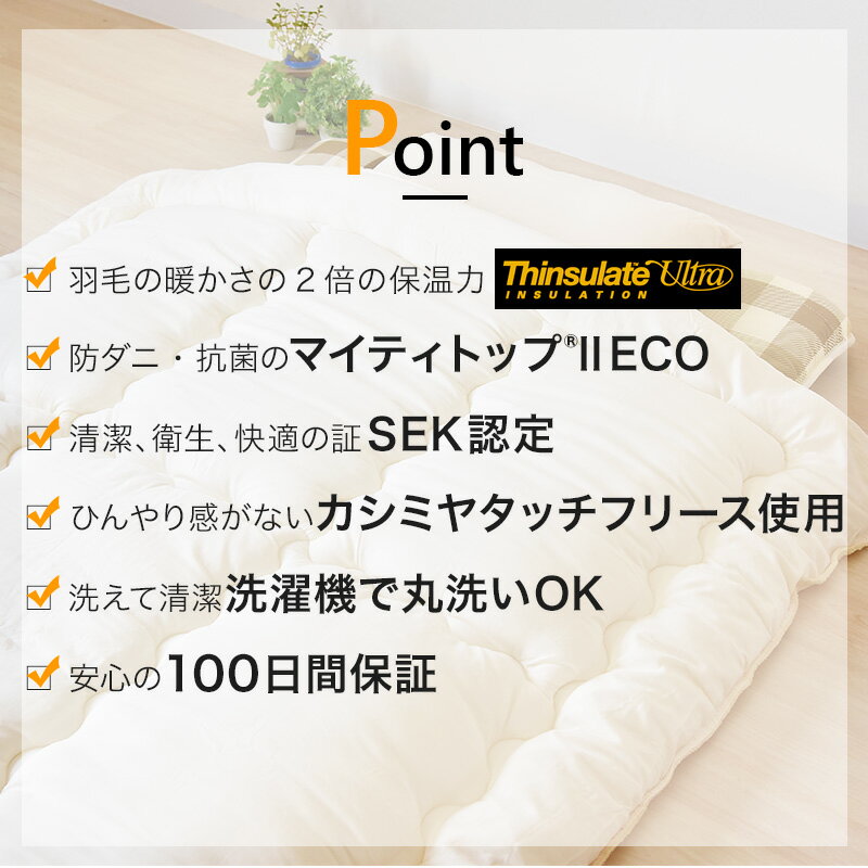 商品説明 サイズ 190×210cm 側地ポリエステル100% 詰め物重量 2.8kg詰め物 上層部帝人マイティトップIIECO(ポリエステル100%) 下層部シンサレートウルトラ150(ポリエステル55%ポリプロピレン45%) 8ヶ所ループ付 生産国日本 ※洗濯機で洗えます。