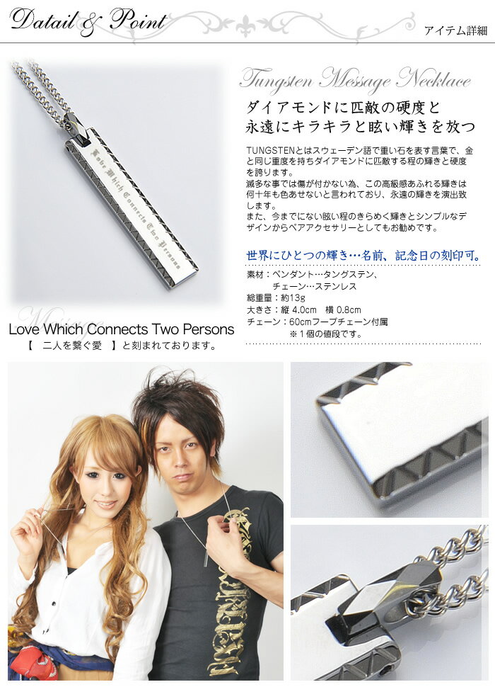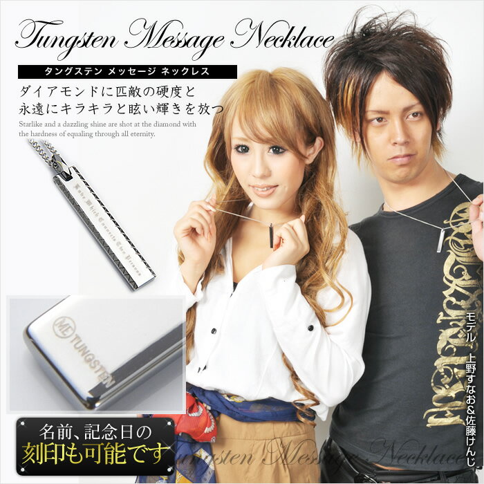 滅多な事では傷が付かない為,この高級感あふれる眩い輝きは何十年も色あせないともいわれております ■裏面に名前 記念日 メッセージの刻印出来ます 刻印内容は注文を進んで頂き【備考欄】にご記入下さい ※裏面の刻印場所は当店がバランスを見て刻印させて頂きます 【例】2013 . 12 . 24 Takuya & Misaki ■素材 ペンダント: タングステン チェーン: ステンレスチェーン 45cm 50cm 60cm ■付属品 専用ギフケース ギフトバッグ ■大きさ:縦:約4.0cm 横:約0.8cm ■ペア2個セット ----------------------- ■関連 刻印 刻印無料 名入れ イニシャル ネーム 名前 記念日 メッセージ 文字 誕生日 文字入れ 自由刻印 自由に刻印 印刻 輝く鏡面仕上げ メタリック シルバー タングステンネックレス タングステンペンダント ペンダント プレート ネームプレート METAL EVOLUTION METAL EVOLUTION メンズ レディース ペア アクセサリー ペア ネックレス ペンダント ペアネックレス ペアペンダント ペアアクセサリー ペアルック カップル -----------------------