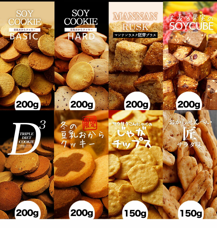 広告文責:ビードットラボ(0120-911-128)、区分:日本製、食品 栄養成分表示(1枚あたり) ベーシックタイプ:エネルギー26.95kcal、脂質1.78g、たんぱく質0.4g、炭水化物2.7g、ナトリウム14.6mg ハードタイプ:エネルギー16.4kcal、脂質1.04g、たんぱく質0.34g、炭水化物1.8g、ナトリウム10.7mg トリプルダイエットクッキー:エネルギー15.75kcal、脂質0.83g、たんぱく質0.3g、炭水化物1.76g、ナトリウム11.7mg 冬の豆乳おからクッキー(ソフトタイプ):エネルギー28.1kcal、脂質1.51g、たんぱく質0.41g、炭水化物3.21g、ナトリウム11.1mg) 胚芽ラスク:エネルギー16.2kcal、脂質0.57g、たんぱく質0.32g、炭水化物2.49g、ナトリウム14.3mg 大麦と果実のソイキューブ:エネルギー47.43kcal、脂質2.36g、たんぱく質1.22g、炭水化物4.55g、ナトリウム11mg さくさく蒟蒻のじゃがチップス:エネルギー8.3kcal、脂質0.11g、たんぱく質0.1g、炭水化物1.19g、ナトリウム4.5mg おからせんべい(サラダ): エネルギー9.3kcal、脂質0.19g、たんぱく質0.18g、炭水化物1.71g、ナトリウム14.58mgコチラの商品はメール便でのお届けとなります。