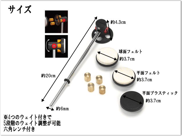 ■特徴1:3種類の異なるビーターで曲やジャンルによって使い分けが出来る! ■特徴2:4つのウェイト(重り)を装着可能!0個〜4個の間で、合計5段階でウェイト調整出来る! ■特徴3:ビーター打面部分が上下に数ミリ単位で角度調整可能! ※ご注文前に、お持ちのペダルのビーター差し込み口のサイズをご確認下さい。