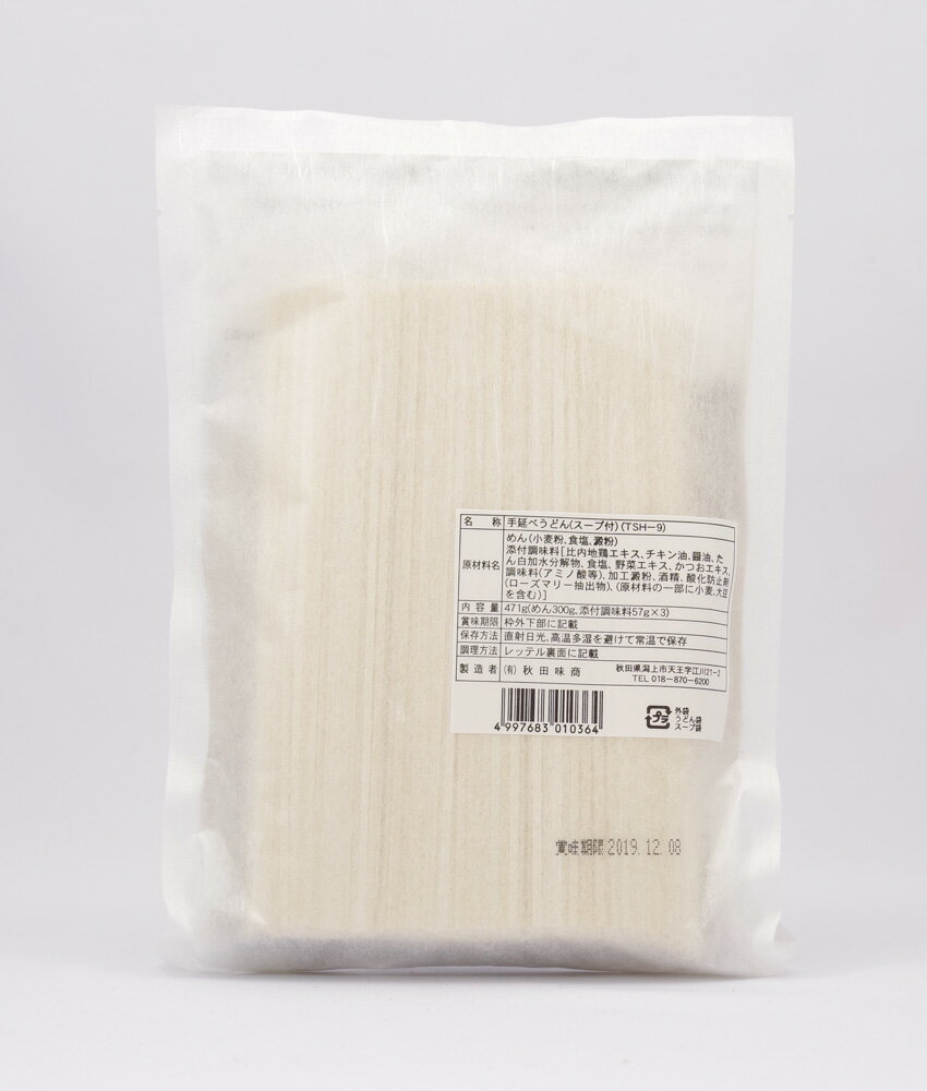 ■社名:秋田味商 ■容量 うどん300g、スープ57g×3 ■原材料 うどん/小麦粉・食塩・澱粉 スープ/チキン油、醤油、比内地鶏エキス、たん白加水分解物、食塩、澱粉、野菜エキス、かつおエキス、調味料(アミノ酸等)、加工澱粉、酒精、酸化防止剤(ローズマリー抽出物)(原材料の一部に大豆を含む) ■発送・保存方法:常温