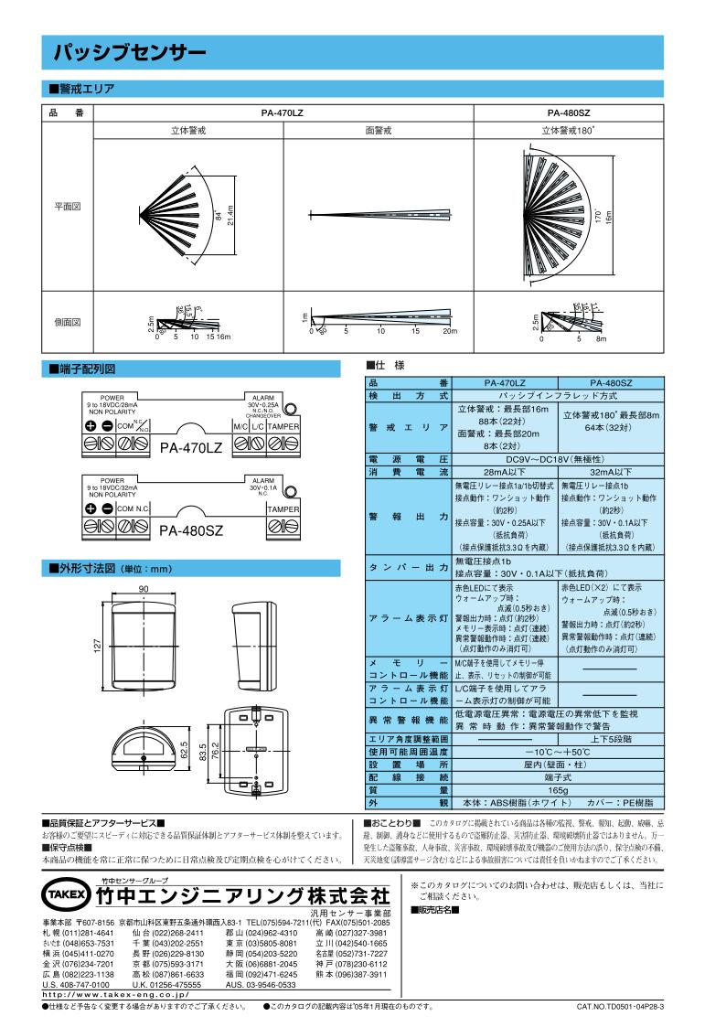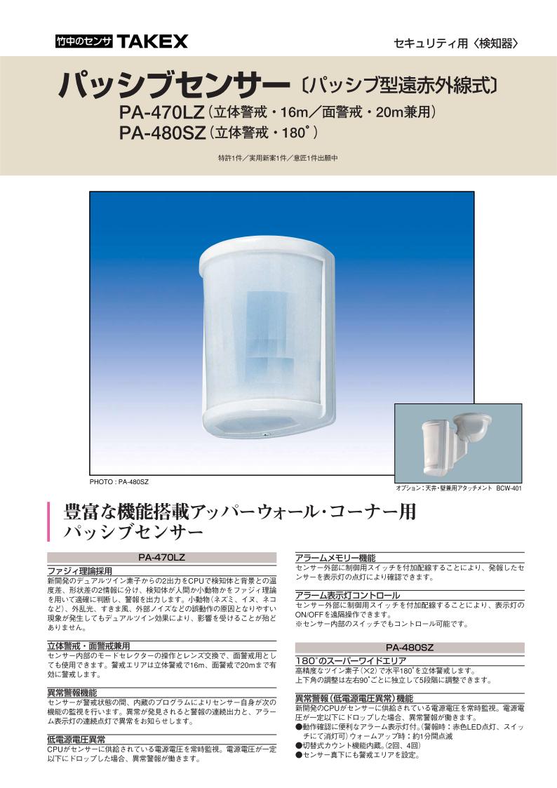 パッシブセンサー 人感センサー 赤外線式 立体警戒 180°【PA-480SZ】TAKEX/竹中エンジニアリング