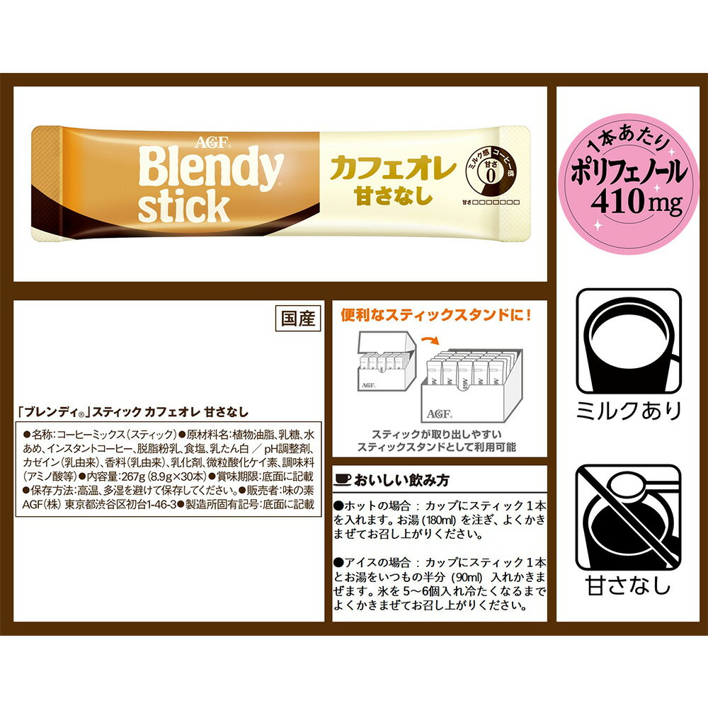 AGF(エージーエフ) 「ブレンディ」 スティック カフェオレ 甘さなし30本は、深煎りコーヒーとまろやかミルクの濃い味わいが楽しめる、砂糖不使用・ノンシュガータイプの甘さなしのカフェオレの中容量サイズです。