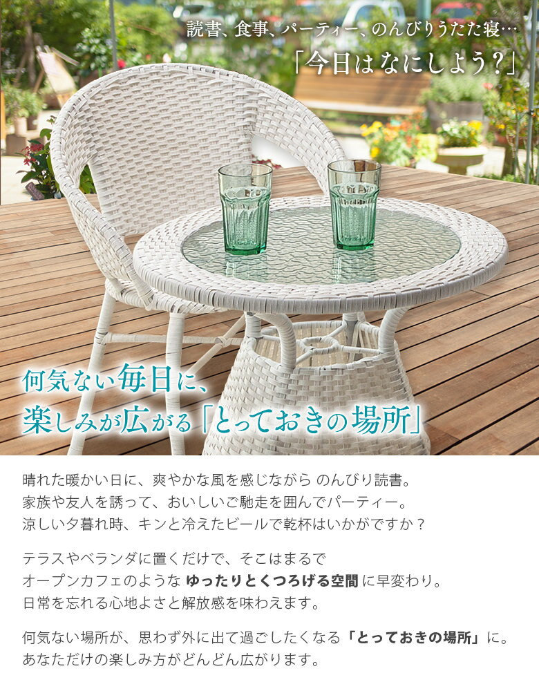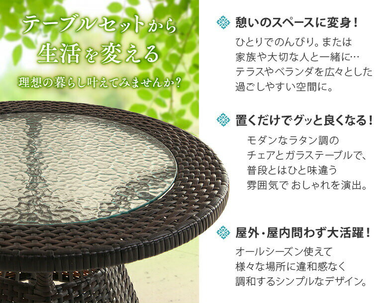 サイズ テーブル:60Φ×高さ62cm 椅子:幅60×奥行き60×高さ76cm(座面高さ42.5cm) 材質 人工ラタン(ポリエチレン製)、強化ガラス 色 ライトブラウン・ホワイト・ダークブラウン 特徴 ※チェア完成品、テーブルを固定するだけの簡単組立て ・高級感のあるラタン調(人工ラタン)。