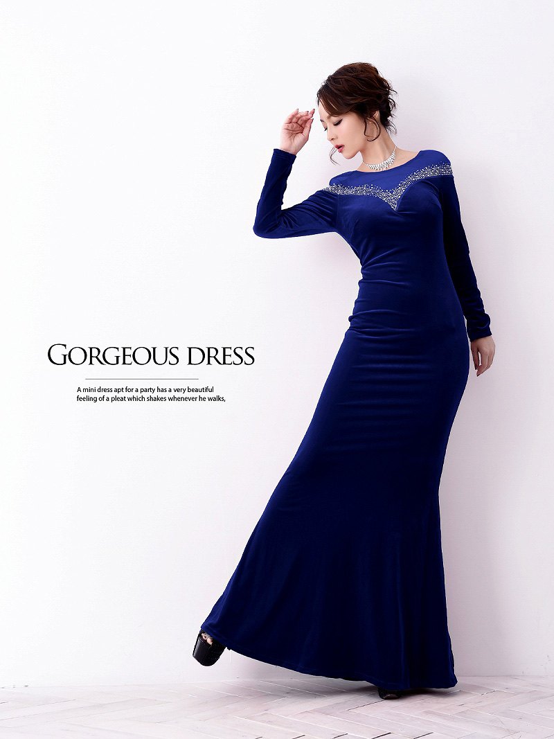ベロア素材が高級感を演出する袖付きドレスはタイトラインから広がるマーメイドドレスで360度sexyスタイル。