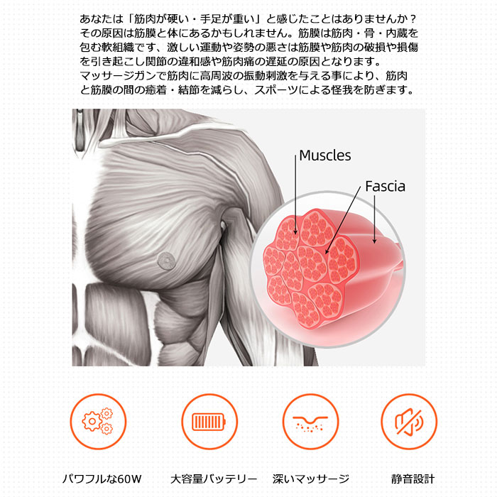 重量 約800g バッテリー容量 1500mAh×6 充電時間 約2.5時間 生産国 中国 関連キーワード マッサージガン マッサージ器 ハンディ コードレス ポータブル 筋膜 リリース ケア 電動 マッサージ機 充電式 5種類ヘッド 静音 軽量 男性 女性 リラックス リラクゼーション スッキリ リフレッシュ ストレッチ 肩 首 腰 背中 肩甲骨 足 解消 美容 健康 癒し グッズ 健康器具 実用的 肩こり 腰こり 筋肉痛 筋肉 乳酸 脚 軽量 全身ケア プレゼント ギフト 送料無料 おすすめ
