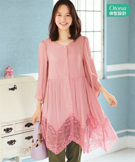 大きいサイズ レディース 7分袖 裾 イレギュラー レース使い チュニック ブラウス ピンク/黒 8LC/10LC ニッセン nissen