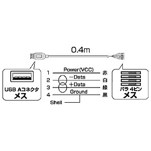 ●USB2.0対応<仕様>■コネクタ:USBAコネクタメス-バラ4Pメス■USB信号:赤(POWER(VCC))白(-Data)緑(+Data)黒(Ground)注意誤った接続をした場合、マザーボードあるいは接続した周辺機器を損傷するおそれがあります。