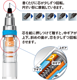 ●機構内部が3つのギアに分かれており、芯に連結された中ギアが、文字を書くときの筆圧を利用して、上下に運動します。